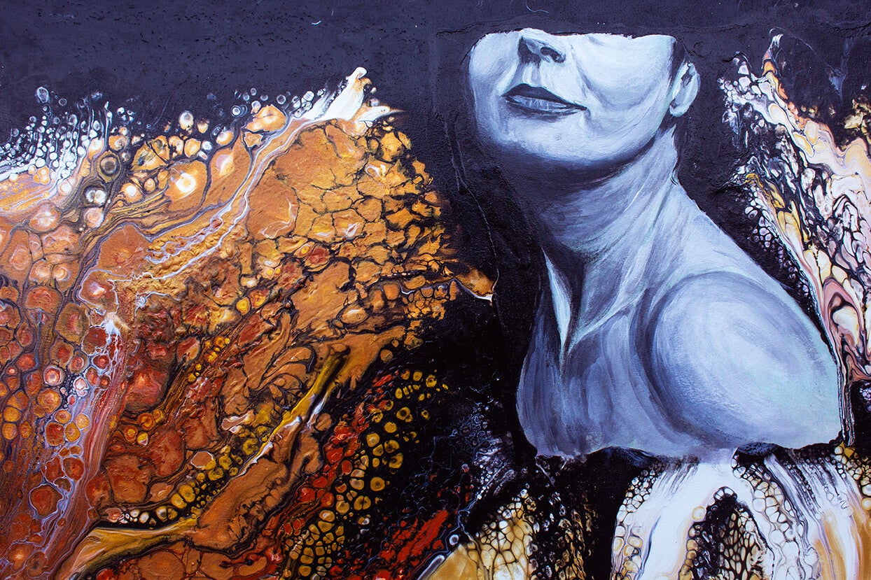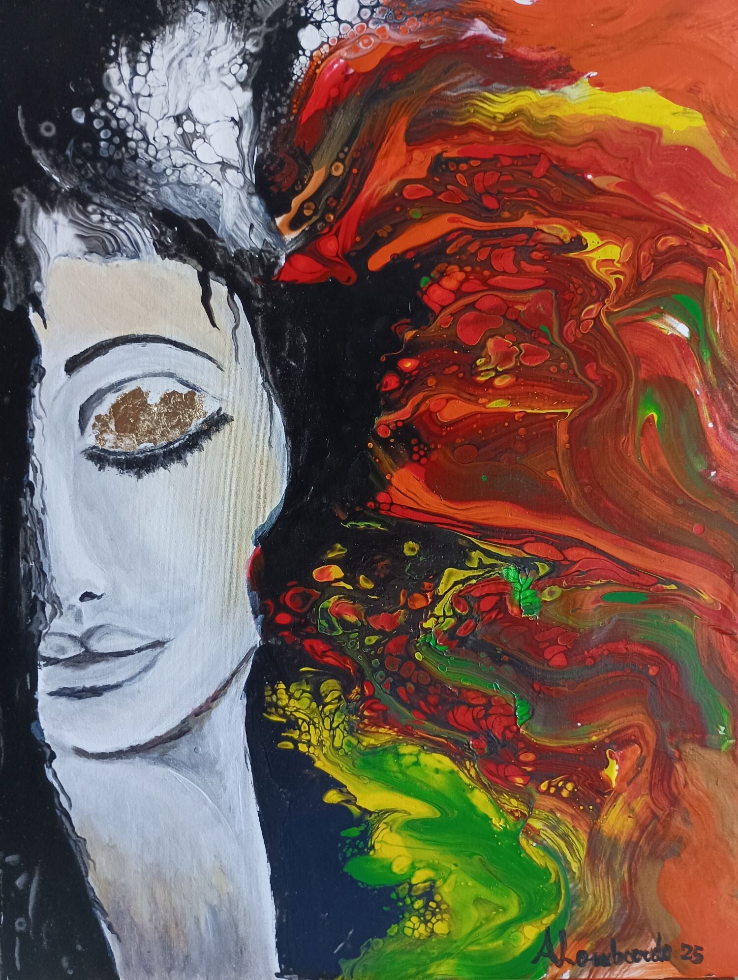 La tecnica è mista, perché uso sia la fluid art per evidenziare le avversità della vita sullo sfondo, sia il pennello per creare il viso stilizzato di una donna che non si arrende di fronte a nulla.